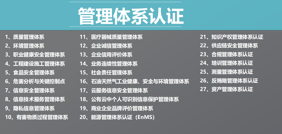 专业从事管理体系认证(QMS、EMS、OHSMS、ISO 22000、HACCP、GB/T 50430、ISO/IEC 27006、ISO/IEC20000-1、ISO 13485、HSE、有害物质过程、云服务信息安全、公有云中个人识别信息保护、企业诚信、隐私信息、业务连续性、企业信用评价、商业企业品牌评价、社会责任等管理体系;服务认证;产品认证(自愿性产品认证、有机产品认证、GAP认证、富硒认证等);绿色产品;绿色制造(绿色工厂、绿色园区、绿色供应链)体系评价;碳中和和碳达峰类业务;温室气体盘查认证等。可颁发带有IAF国际多边互认标志和CNAS中国合格评定国家认可委员会标志,JAS-ANZ澳洲及大西洋州认可的证书,具有公正性、国际性、权威性。荣获过“中国成长性企业”、“中国时代优秀诚信示范单位”、“中国认证认可协会理事单位”。
